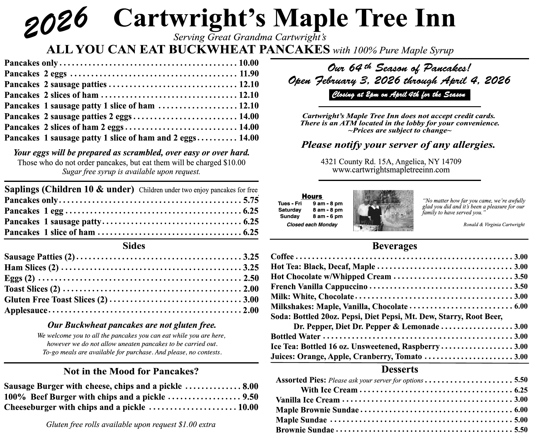 The Cartwright business has seen much progress over the years. The family has grown and now the grandchildren are helping. The restaurant has been remodeled and expanded many times, all the while perfecting the famous family pancake recipe. The restaurant originally seated just fifteen people. The family places over 10,000 taps each year and most of the sap is piped by tubing to holding tanks. The large evaporator is still fired by wood, but the time-consuming task of boiling has been greatly reduced by the 1984 installation of a reverse osmosis machine. This modern equipment removes the excess water from the sap, thus reducing the time and energy needed to produce syrup. In 2006, we became the first syrup producer in the United States to own and operate a state-of-the-art evaporator. This stainless steel evaporator is lead free, has a pre-heater to warm the sap prior to boiling, uses less wood, and operates more efficiently, assuring greater control in producing high quality syrup. Our new Reverse Osmosis Machine, purchased in 2015, can process 3600 gallons of raw sap per hour.